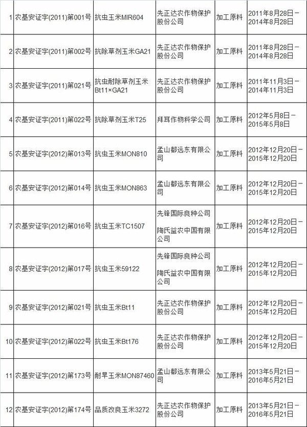 其他仍然有效可以合法進(jìn)入中國市場的轉(zhuǎn)基因玉米品種分別來自拜耳作物科學(xué)公司、孟山都遠(yuǎn)東有限公司、先鋒國際良種公司、陶氏益農(nóng)中國有限公司。 (原標(biāo)題《中國準(zhǔn)12種轉(zhuǎn)基因玉米進(jìn)口》)