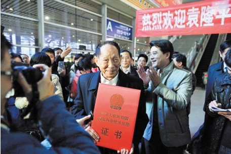 1月10日,在北京人民大會堂,袁隆平捧回一個鼓舞全體農(nóng)業(yè)科技者、全體湖南人的榮譽——國家科技進步特等獎。這是袁隆平第二次登上國家最高科技獎的領(lǐng)獎臺。