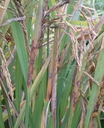 穗頸瘟:發(fā)生于主穗梗至第一枝梗分枝的穗頸部,初期形成褐色小點(diǎn),后使穗頸部變褐,幼嫩的穗頸和穗軸受到病菌侵染后,輸導(dǎo)組織受害,養(yǎng)分和水分不能上輸,造成部分或全部白穗。