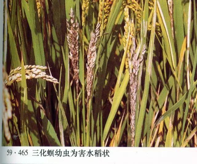 二化螟 :孕穗期為害造成枯孕穗,抽穗期為害則造成白穗,乳熟期至成熟期為害則造成蟲傷株。